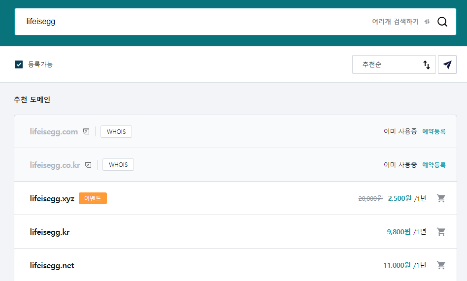• hostingkr의 링크를 따라가서 설정하고자하는 도메인을 검색하고 구입한다.