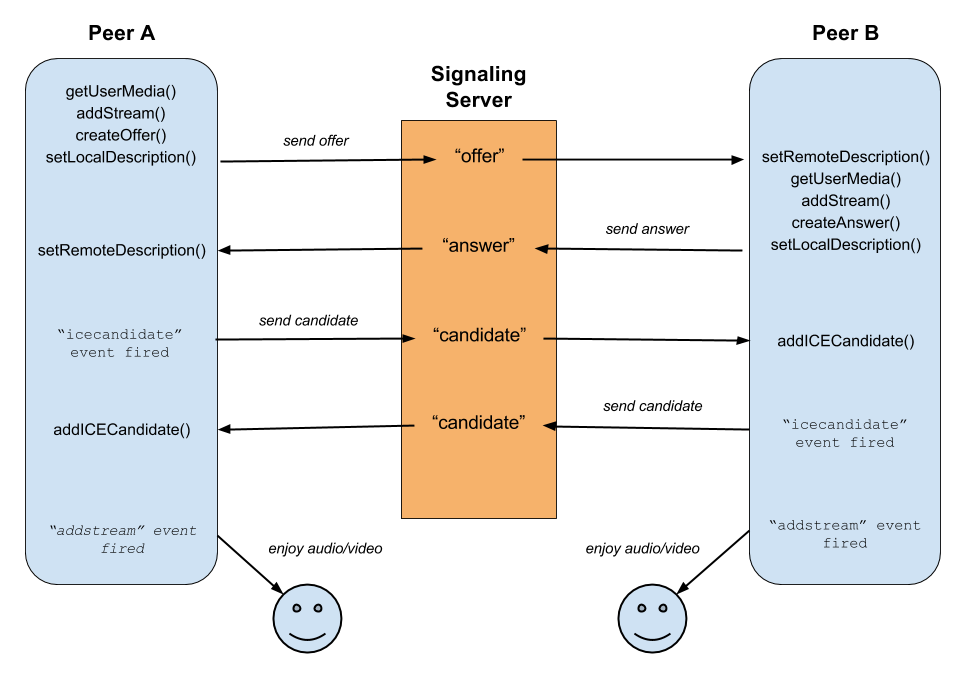 두 피어중 하나의 피어(A)가 먼저 다른 피어(B)에게 제안을 보내고, 제안을 받은 피어는 그에 대한 응답을 합니다. 그리고 두 피어가 candidate를 교환합니다. 시그널링 절차가 성공적으로 진행된 경우 연결이 완료되며 스트림 데이터(미디어/오디오)를 확인할 수 있습니다. 이 과정 제안/수락 과정에서 피어가 SDP를 교환합니다.