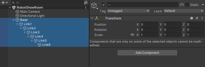 오브젝트 이름을 최상단부터 Base, Link1, Link2, ..., Link6 로 지었습니다.