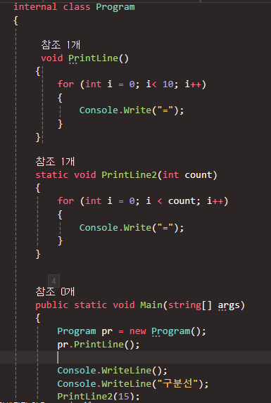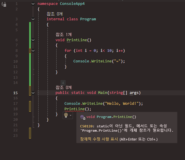 -> 이건 Program.PrintLine() 이라고 써도 안 된다. 방법은 PrintLine()에다가 static을 붙이면 된다. (Main에서 static을 떼면 빌드 오류가 나기 때문)