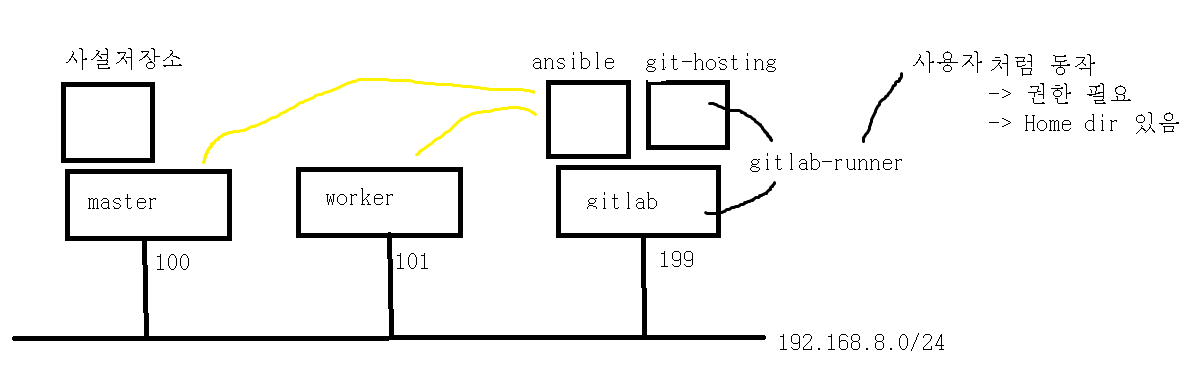 - Gitlab-Runner 가 실행하는 명령을 Ansible 에게 전달하여, Ansible 이 각 Node 에 명령을 전달해주는 구조이다