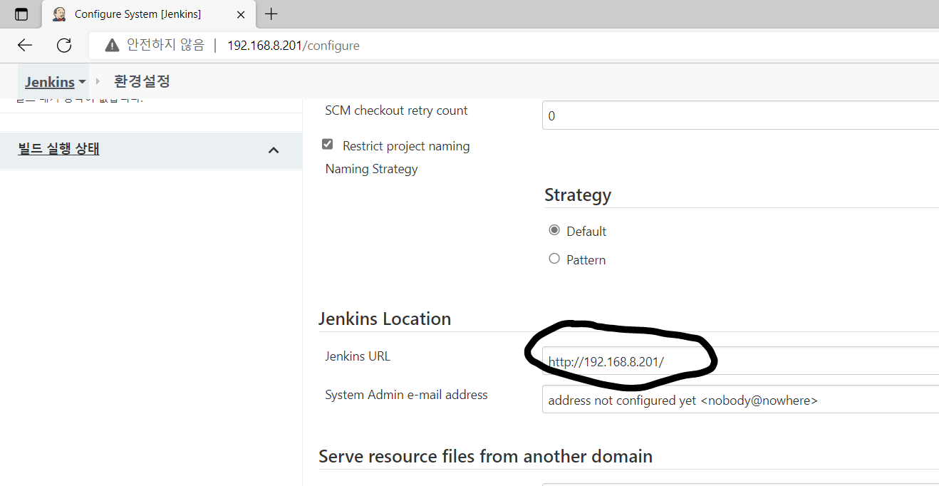 - Jenkins 관리의 시스템 설정에 들어가자. Jenkins URL 의 주소가 맞는지 확인하자