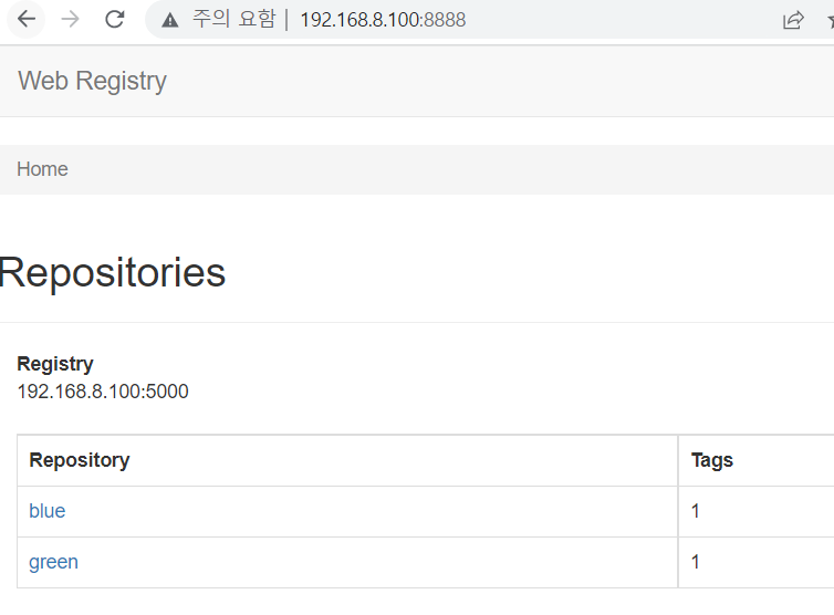 - 해당 Image 를 192.168.8.100:5000/blue:1.0 과 green:1.0 으로 이름을 변경하여 사설 저장소에 Push 하자
