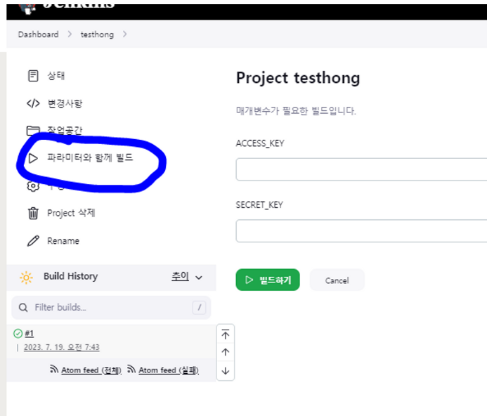 - 파라미터와 함께 빌드를 선택하자. AWS Access Key와 Secret Key를 입력하고, Build를 실행하자