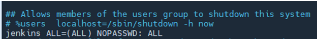 - Jenkins에서 Job 실행 시, sudo 명령을 쓰는데 password를 요구하지 않도록 설정하자