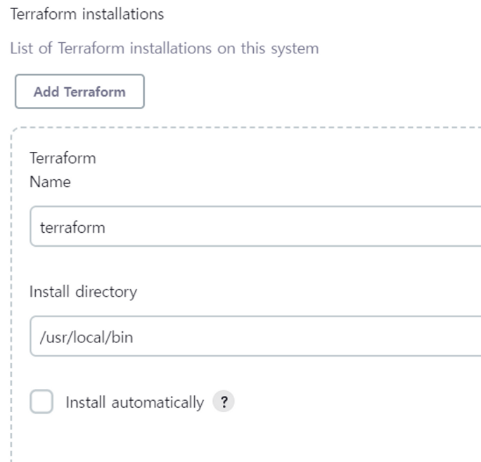 - Install automatically 체크를 해제하고, Terraform이 설치된 경로를 설정해주면 된다