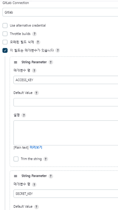 - AWS Access Key와 Secret Key는 Job Build 할 때, 매개변수로 입력받도록 설정하자