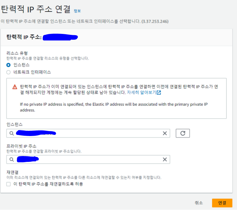 - 탄력적 IP를 할당 받고, 생성한 EC2 인스턴스에 연결하자