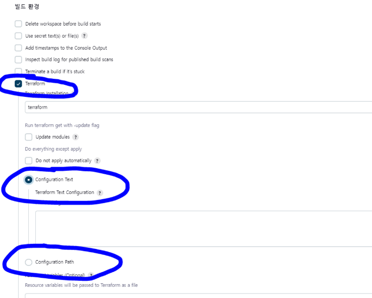 - Terraform 플러그인을 이용하면, 위와 같이 Job 생성 시에 Terraform 구성 파일 내용을 직접 입력할 수 있는 Configuration Text나 Terraform에 적용시킬 구성 파일의 위치를 지정하는 Configuration Path와 같은 편의 기능을 사용할 수 있다