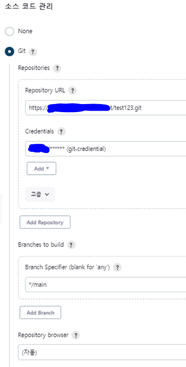 - 소스 코드 관리에서 레포지토리 주소, 사용할 GitLab Credential, Branch를 설정하자