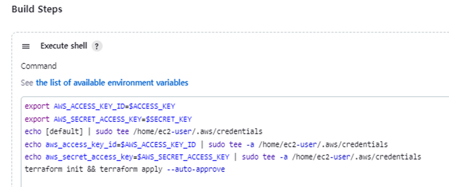 export AWS_ACCESS_KEY_ID=$ACCESS_KEY export AWS_SECRET_ACCESS_KEY=$SECRET_KEY echo [default] | sudo tee /home/ec2-user/.aws/credentials echo aws_access_key_id=$AWS_ACCESS_KEY_ID | sudo tee -a /home/ec2-user/.aws/credentials echo aws_secret_access_key=$AWS_SECRET_ACCESS_KEY | sudo tee -a /home/ec2-user/.aws/credentials terraform init && terraform apply --auto-approve
