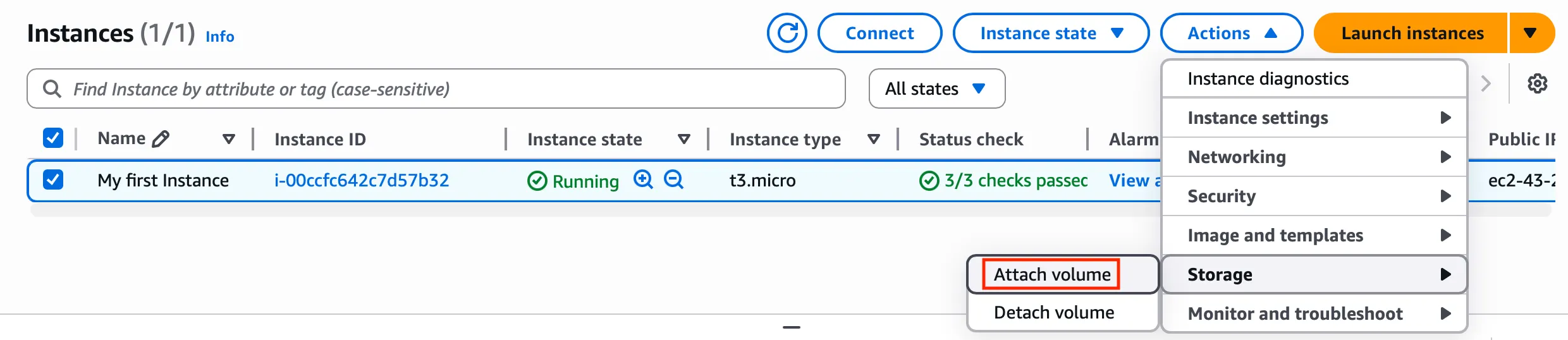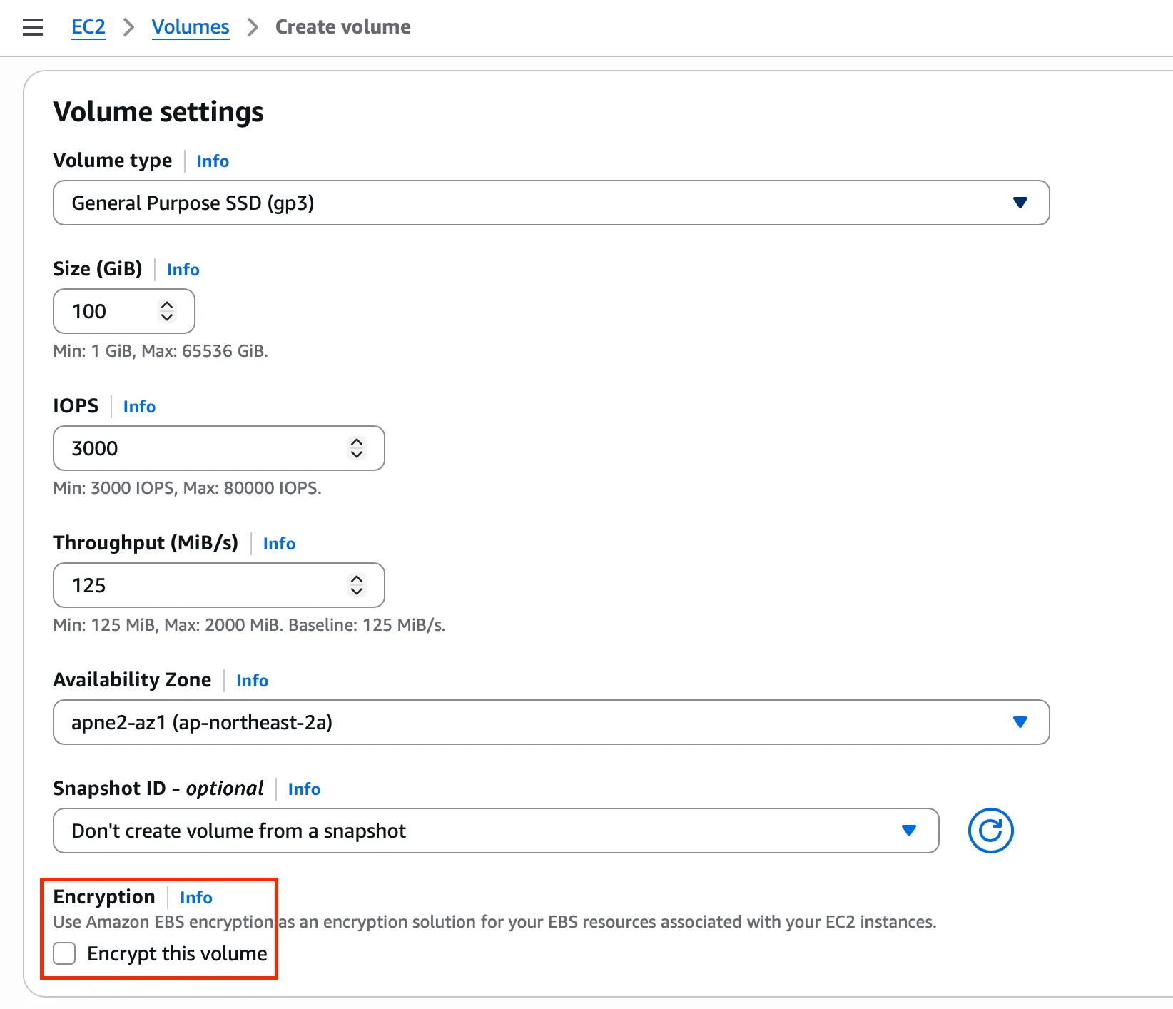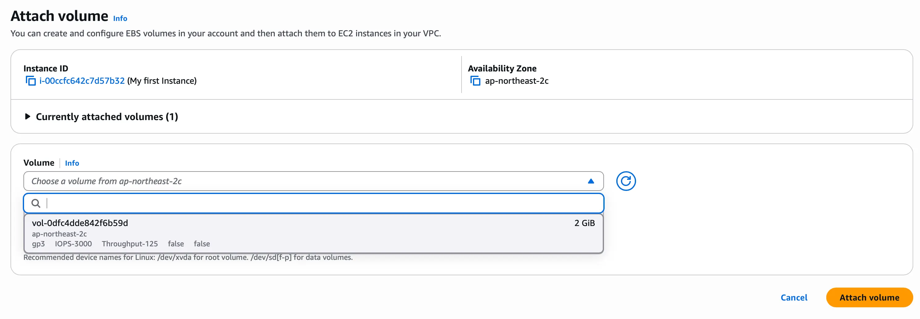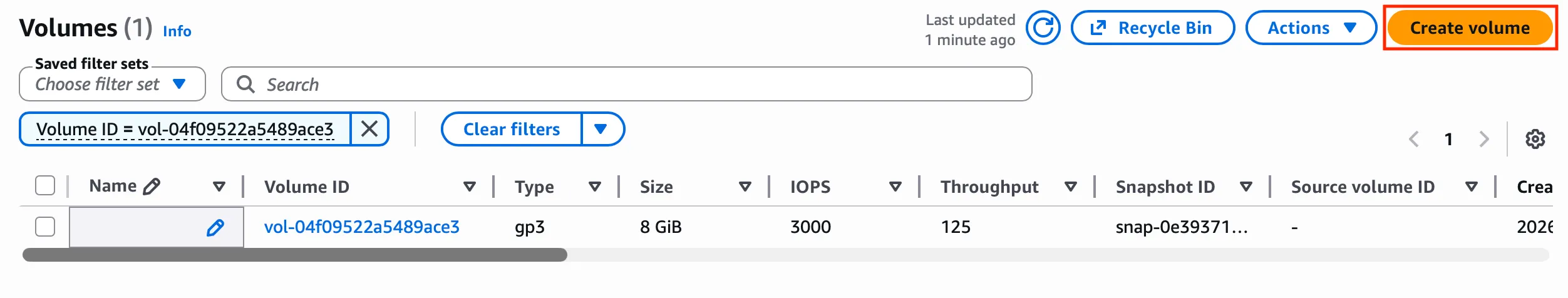 AWS Console에서 Elastic Block Storage → Volume → 우측 상단의 Create volume