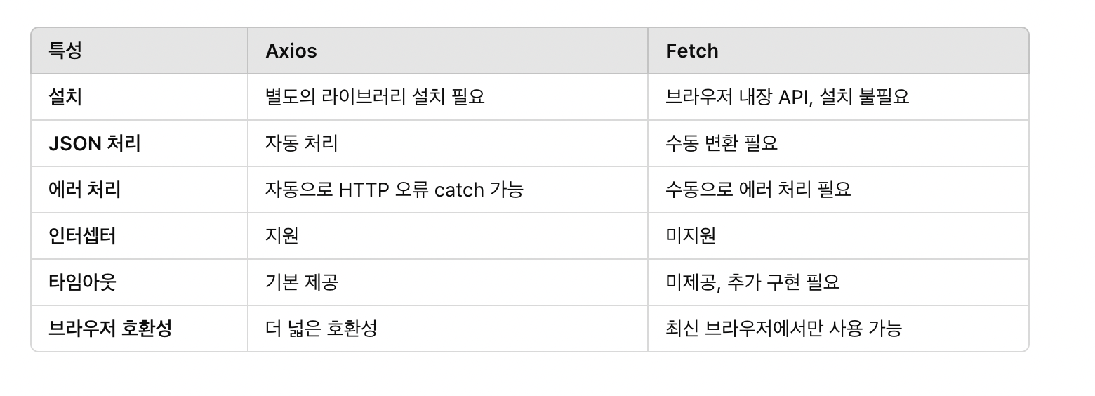 데이터 처리: Fetch는 JSON으로 변환하는 과정이 필요하고, Axios는 자동으로 데이터를 JSON으로 처리해준다.