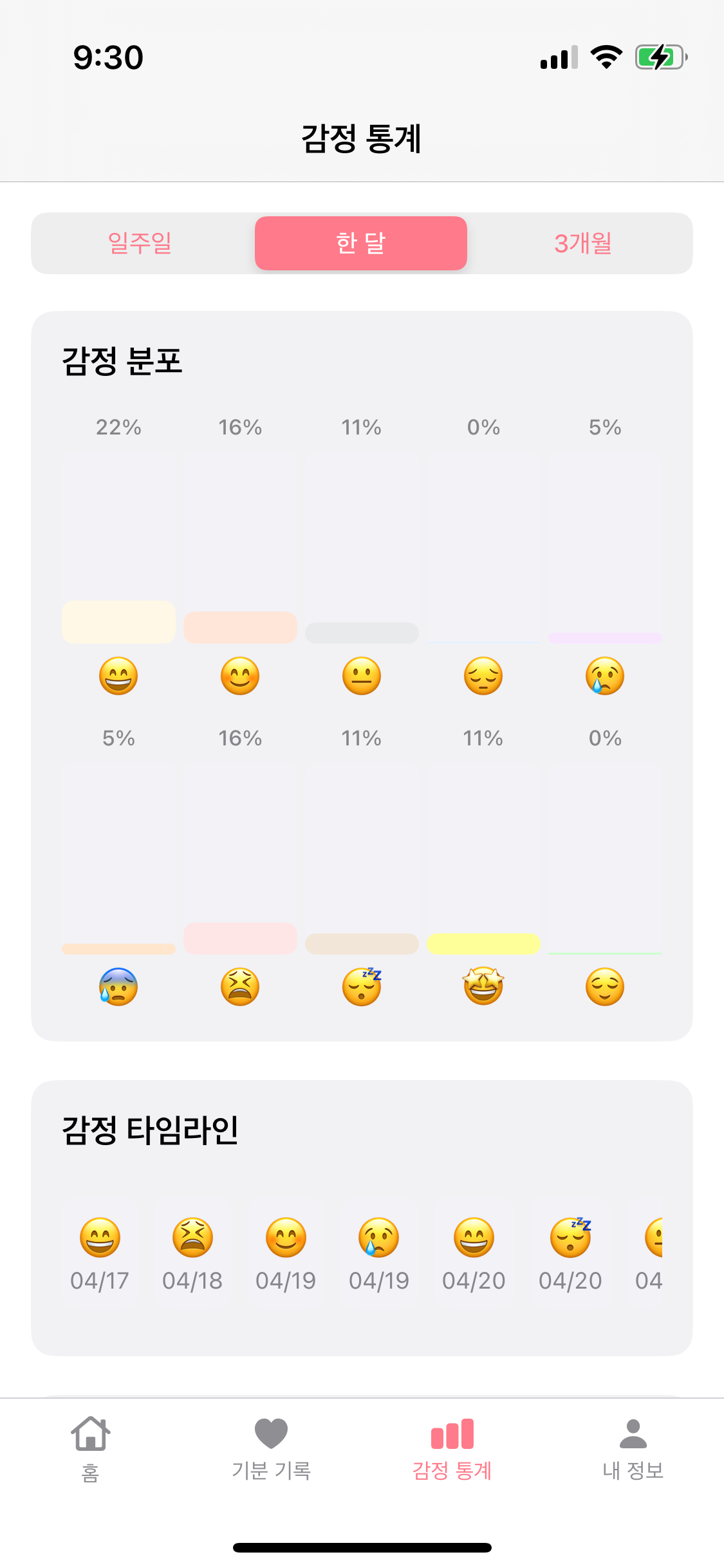 - 주/월/3개월 단위로 감정 흐름을 확인할 수 있게 구성