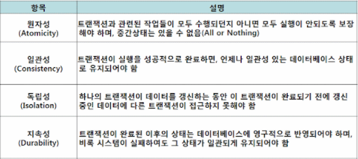 ACID : 작업들이 하나의 작업처럼 취급되어서 모두 성공하거나 모두 실패하는 것