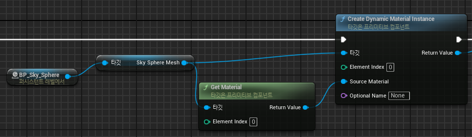 Source Material에는 Sky Sphere Mesh의 머티리얼을 가져와 연결해주긴 했지만, 연결이 안 되어있어도 색은 바꾸는 데는 문제 없다.