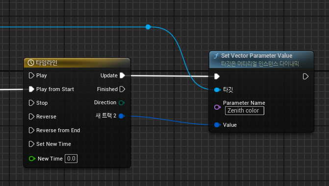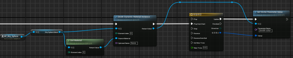 타임라인이 실행되는 동안에는 Set Vector Parameter Value 노드를 통해 하늘의 색이 서서히 바뀌도록 해주었다.
