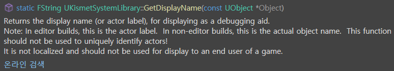 GetDisplayName()은 디버깅 용도이며, 에디터 빌드에서는 액터 라벨을 반환하고 그 이외에는 실제 오브젝트명을 반환한다.