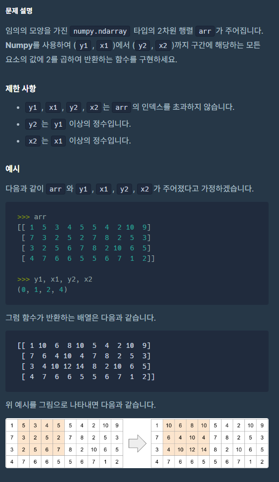 - 브로드캐스팅을 이용하여 접근한 영역의 모든 요소에 2씩 곱합니다.