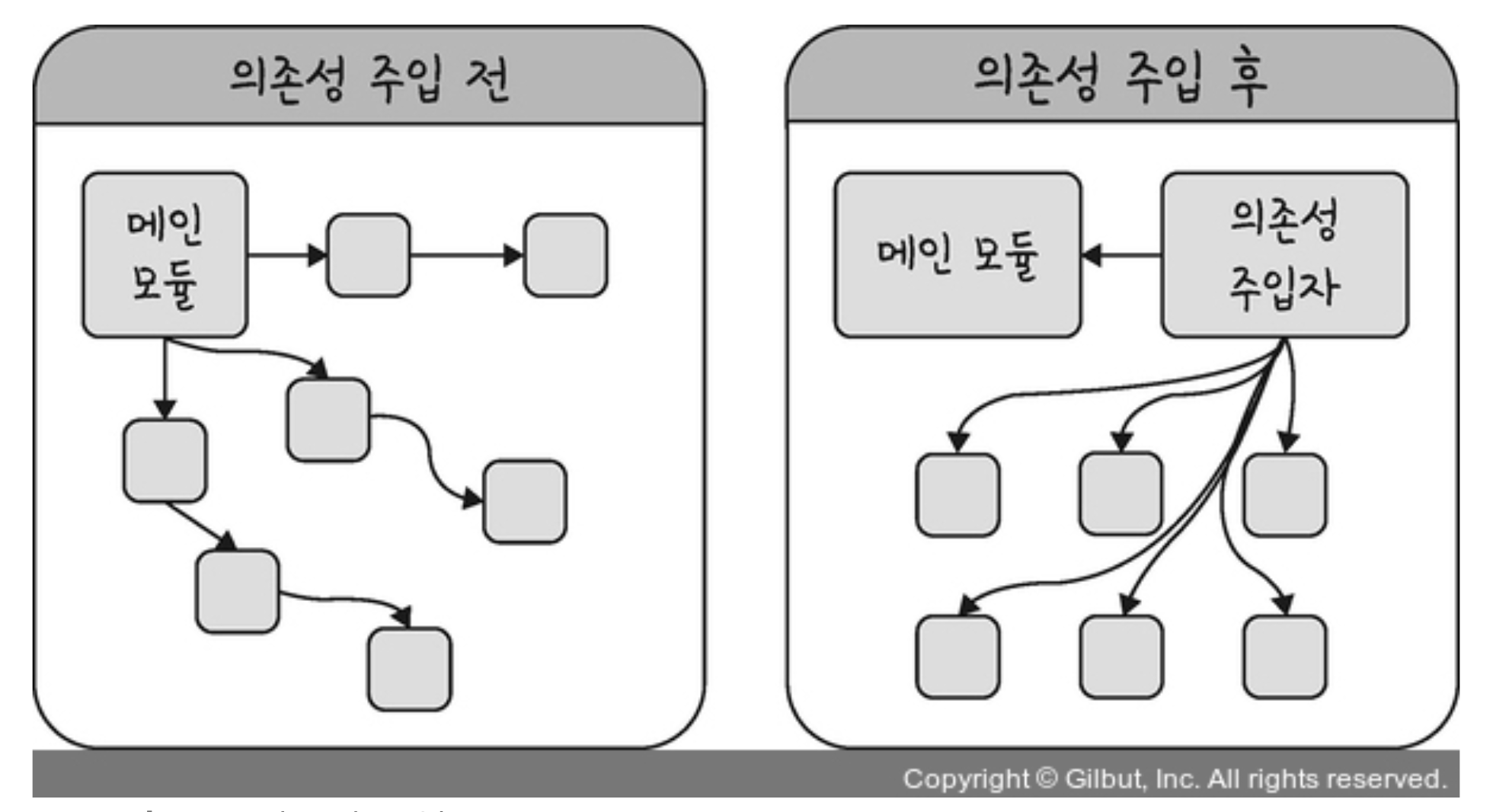 의존성 주입이란 첫번째 그림처럼 Main모듈이 직접 다른 하위 모듈에 대한 의존성을 주기보다는 중간에 의존성 주입자(Dependency Injector)가 이 부분을 가로채 메인 모듈이 간접적으로 의존성을 주입하는 방식이다.