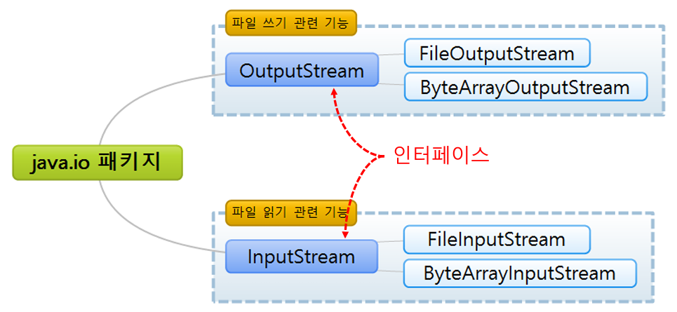 - 스트림 관련 클래스들은 각각 InputStream(입력/읽기), OutputStream(출력/저장)과 관련된 인터페이스를 상속받기 때문에 모두 동일한 메서드를 가지고 있다.