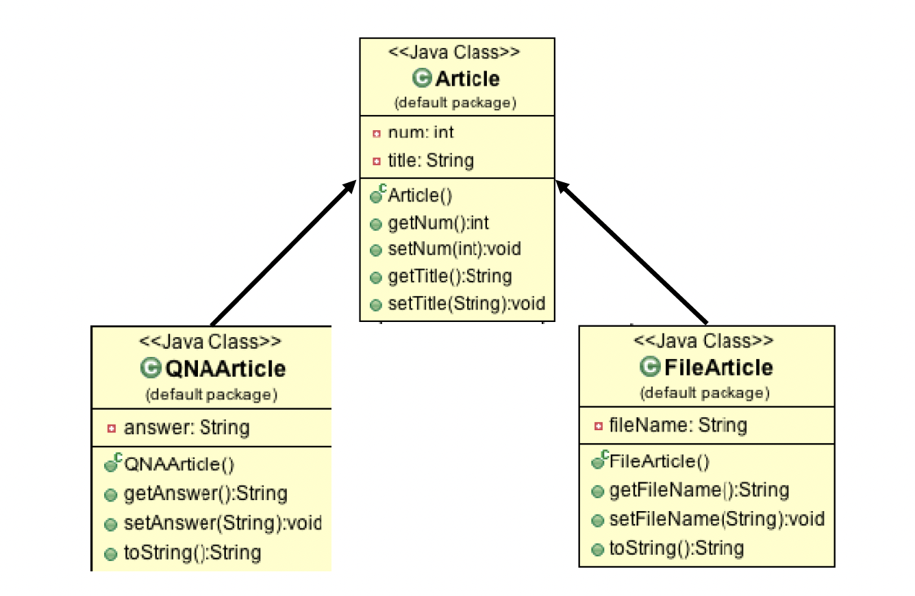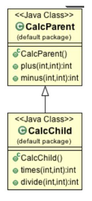 - 클래스 다이어그램에서 CalcChild 클래스는 CalcParent클래스를 상속받기때문에 별도 소스코딩 없이도 plus() 메서드와 minus() 메서드를 포함하게 된다.