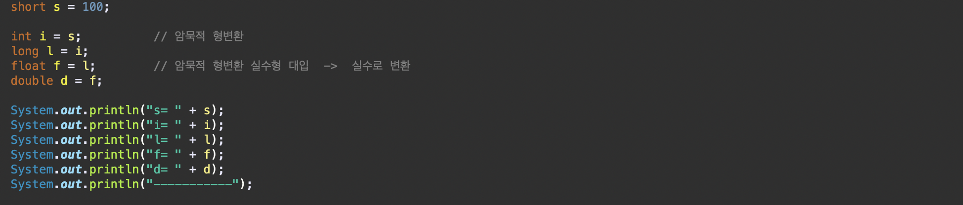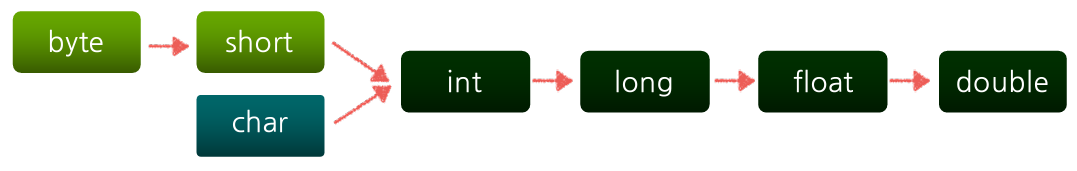 - 암묵적 형변환이 허용하는 범위 : 암묵적 형변환은 데이터 손실이 발생하지 않는 범위 내에서만 이뤄짐