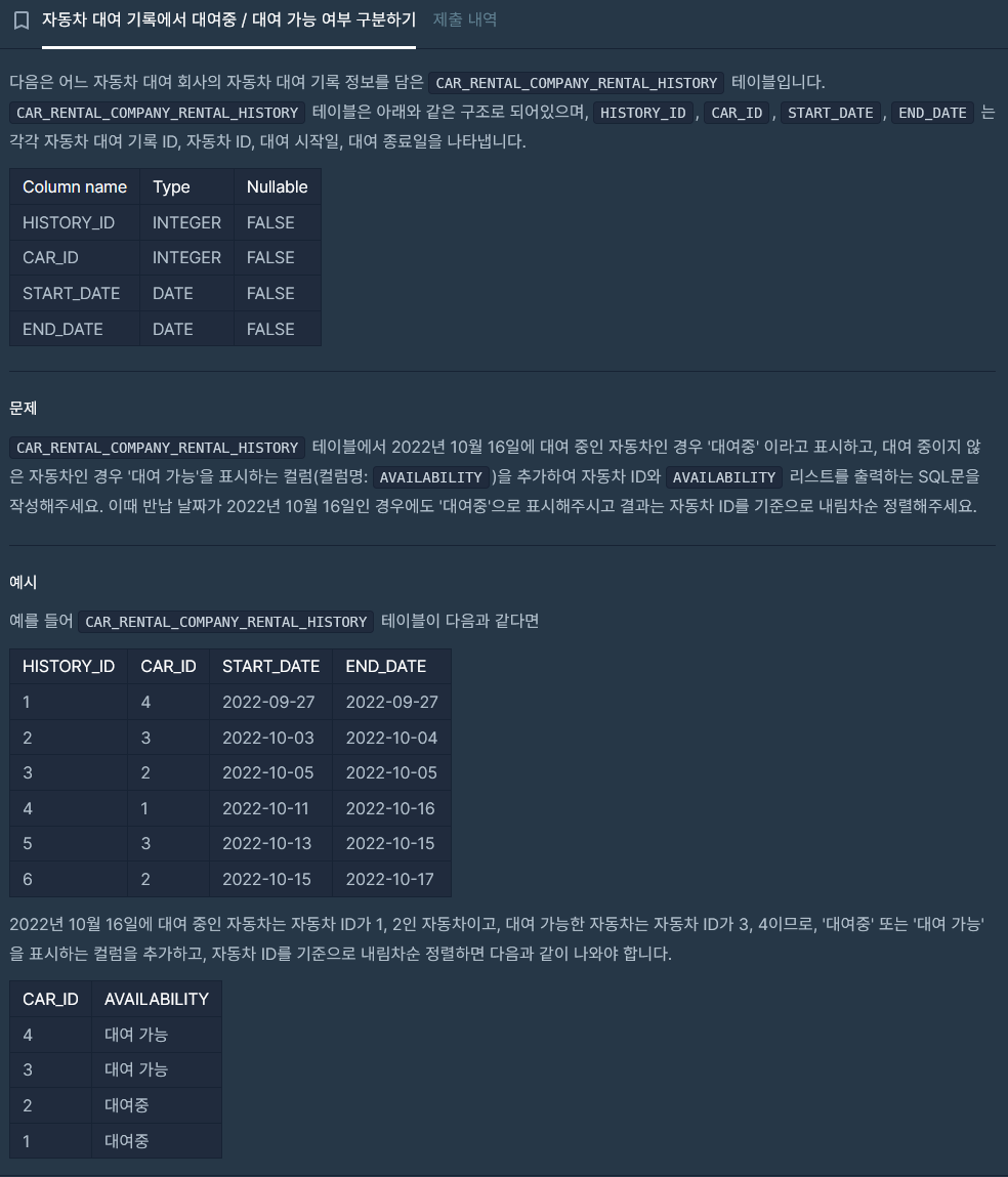case when MAX('2022-10-16' Between Start_date and End_date) then '대여중'