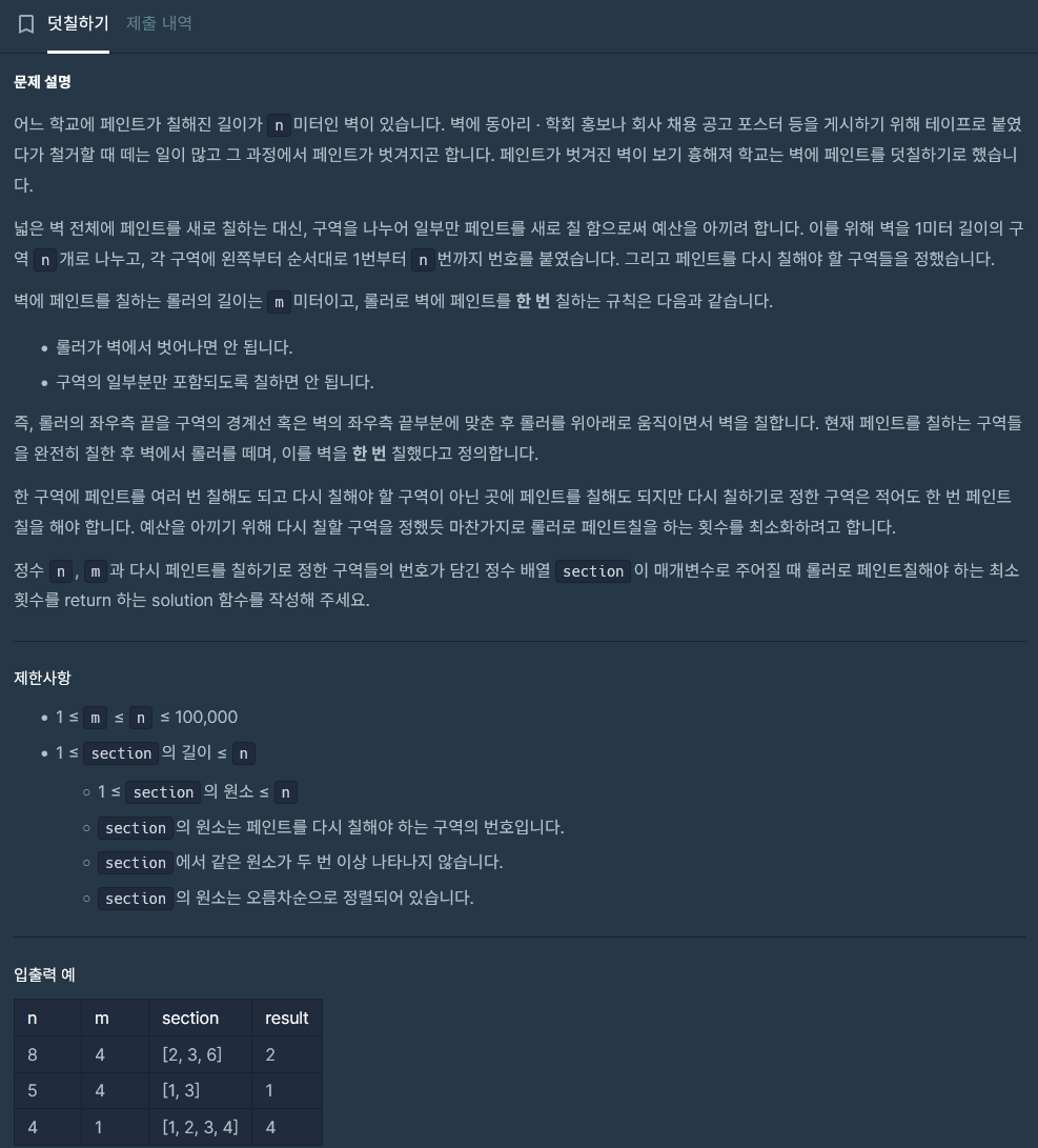 public int solution(int n, int m, int[] section) {