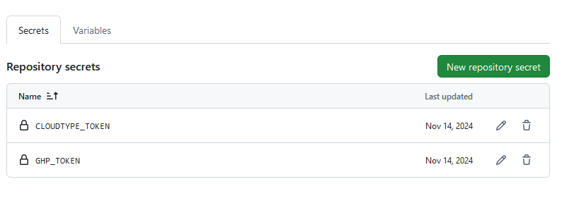 ghtoken: ${{ secrets.GHP_TOKEN }} 과 ${{ secrets.CLOUDTYPE_TOKEN }} 토큰 값이 없기에 Actions가 오류가 나는것을 확인할 수 있다.