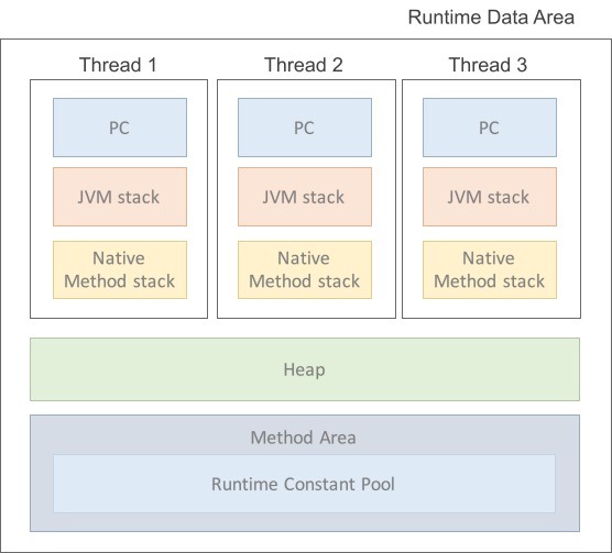Method Area (= Class area = Static area) : 클래스정보를 메모리공간에 올릴때 초기화되는 대상을 저장하기 위한 메모리공간. 클래스, 인터페이스, 메소드, 필드, Static 변수 등의 바이트 코드를 보관.