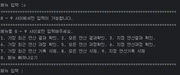 1. 문제발생 : 연산에대한 저장값 접근에 대하여 생각보다 많은 메뉴로 인한 문자가 아닌 숫자로 입력을 받고 검증작업 필요성이 발생.