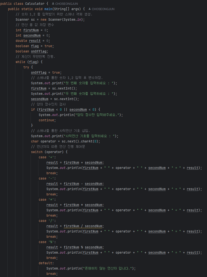 2. 원인 : 코드를 구성하면서 연산자구별 제어문에 그외 문자일경우 상황이 빠져있는것을 확인.