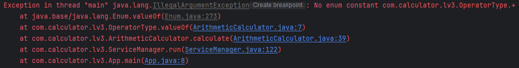 1. 문제발생 : 해당 enum Class 를 활용해 필드값으로 사칙연산 기호를 주어 enum 매칭된 객체를 반환받기 위해 .valueOf(operator) 메소드를 사용.