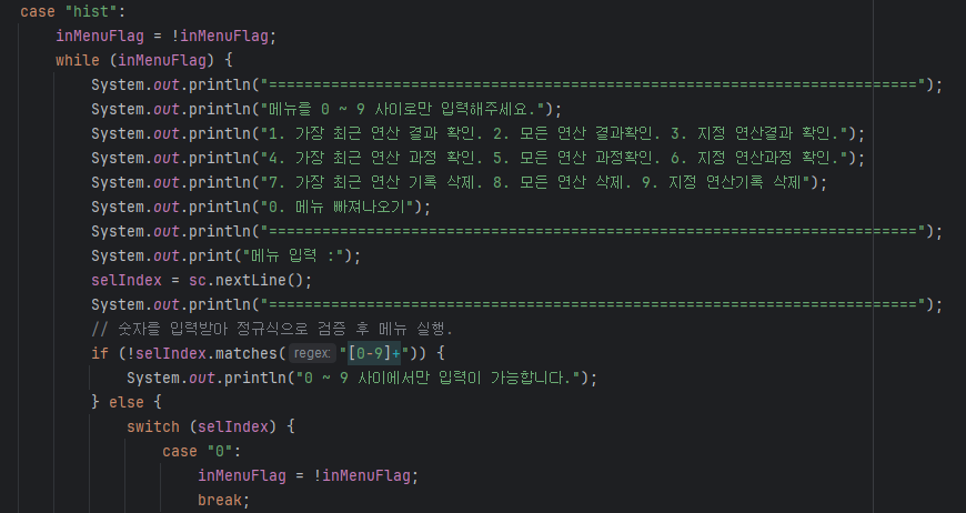 System.out.println("지정 순번의 결과는 = " + calc.getResult(Integer.parseInt(selIndex)) + " 입니다.");