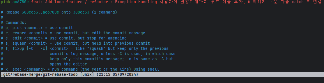 git rebase HEAD~1 -i // 바로직전 커밋메세지 수정을 위한 에디터 모드 진입