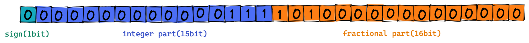 고정소수점 : 정수와 소수사이의 위치를 미리 '고정'하고 해당 비트만을 활용해 실수를 표현.