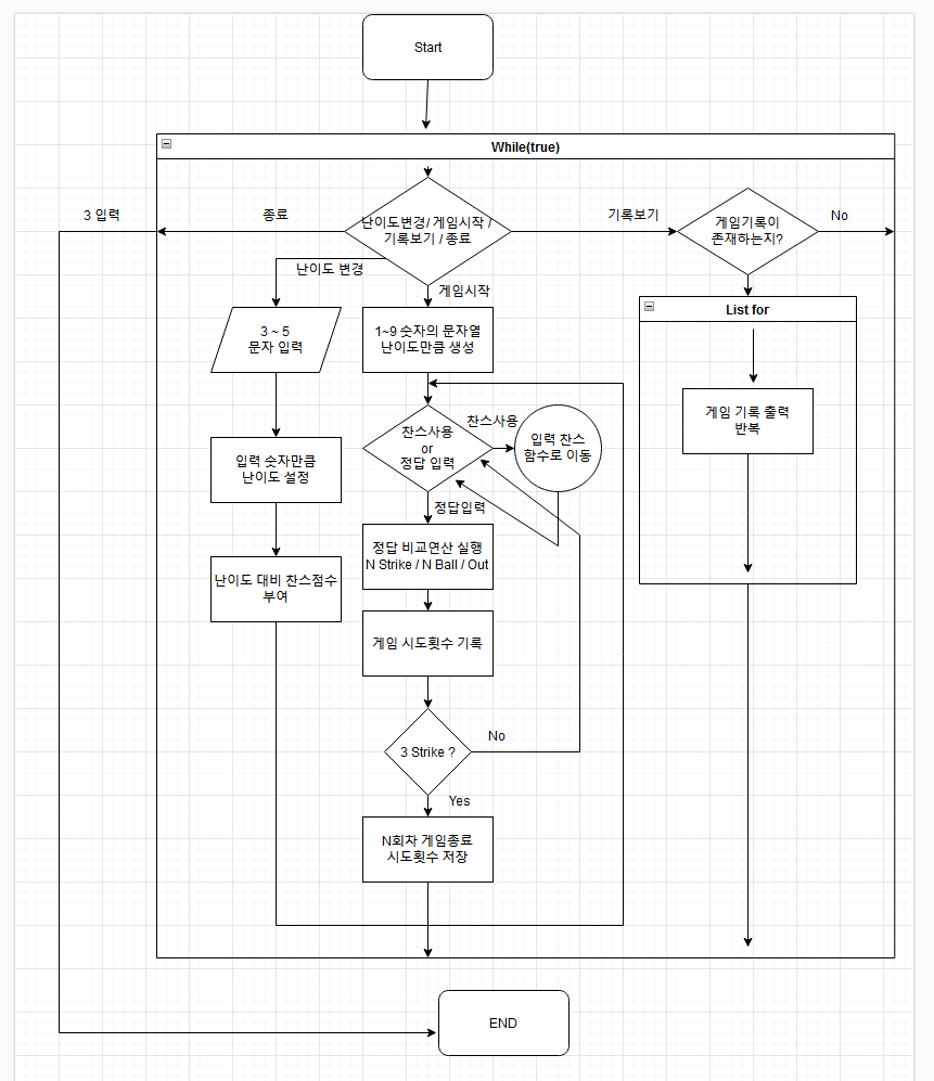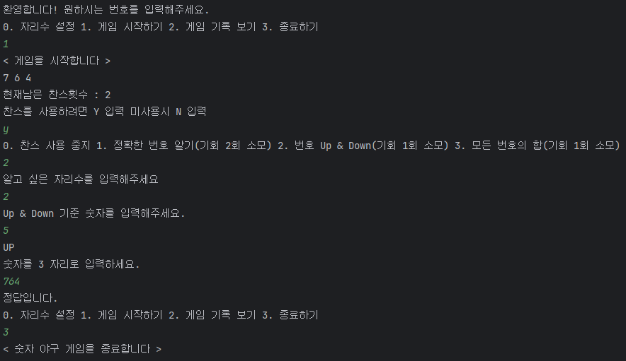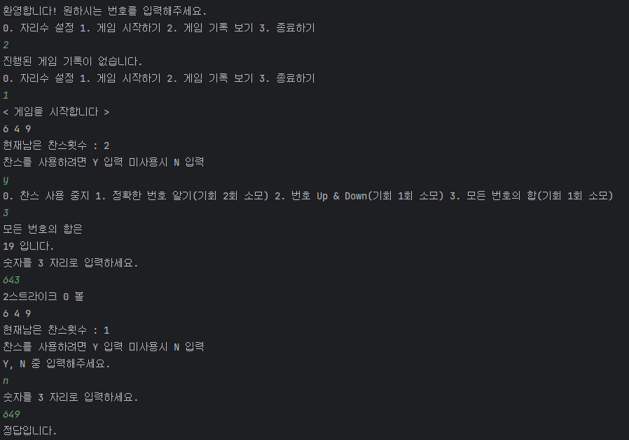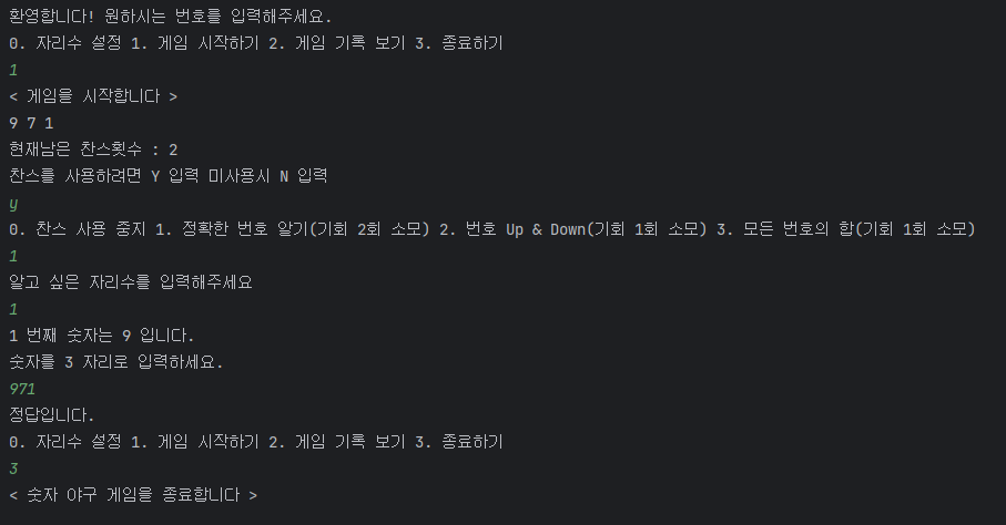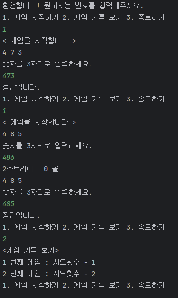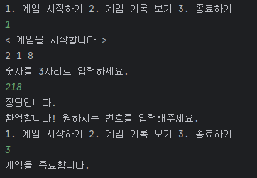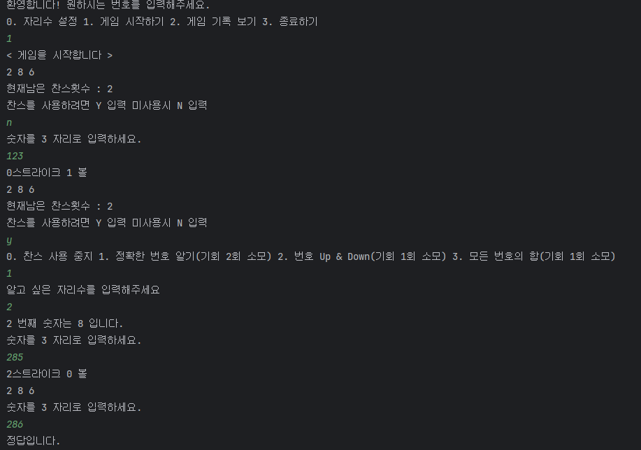 3자리수 , 중복불가 , 숫자 외 문자입력불가 if (userNumList.contains(Character.getNumericValue(c)) || Character.getNumericValue(c) == 0 || !Character.isDigit(c)) 조건문을 통해 입력값 유효성 검사. // 게임 시작시 메인메뉴 출력
