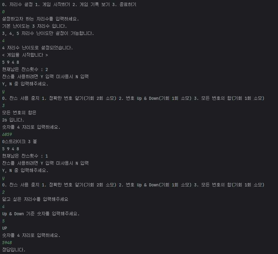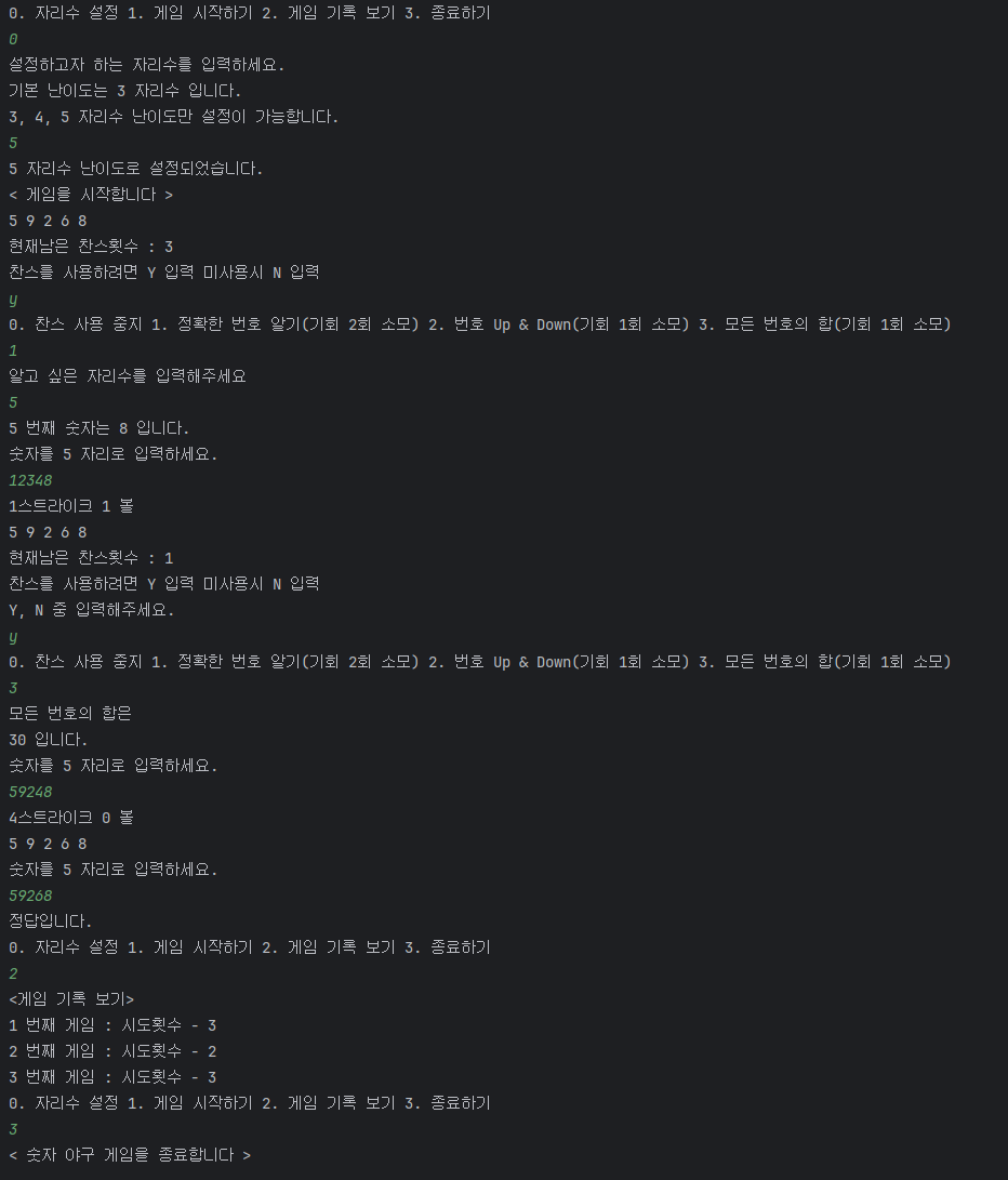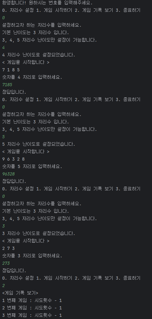 자리수는 3,4,5 외엔 입력불가 , 자리수에 따른 게임 난이도 변화setDifficulty() 메소드를 통해 difficulty 필드에 값을 조정. difficulty 값을 static으로 설정한 이유는 값을 공유하여 사용할일이 더 많기 때문에.difficulty의 기준하에 맞춰지도록 변경.