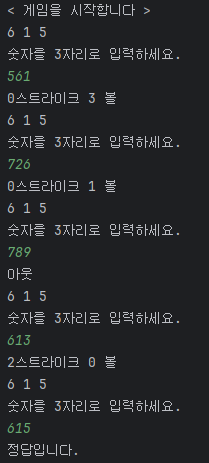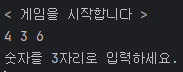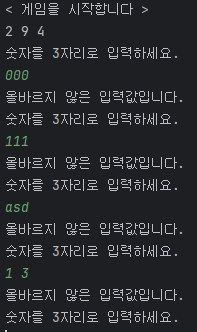 중복되지않은 3자리숫자 , 숫자 외 입력 불가while() 반복문을 통하여 유저에게 3자리 숫자를 한개의 문자열로 입력받아 4자리 미만인지 확인 후 문자열을 분해하여 1개의 문자를 유효성검사를 진행한다.if (userNumList.contains(Character.getNumericValue(c)) || Character.getNumericValue(c) == 0 || !Character.isDigit(c)) 조건문을 통해 중복값이 있는지, 0이 포함되있는지, 숫자외 문자인지 검사 한 뒤 userNumList 에 저장한다.