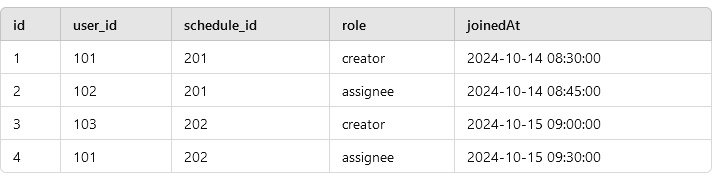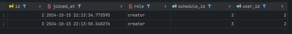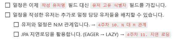 일정 : 유저 가 N : M 관계로 지정되면서 의도하지 않아도 중간테이블이 발생.N : M 관계인 @ManyToMany 어노테이션을 사용하게되면 자동적으로 중간테이블을 작성해서 관리한다.@ManyToOne(fetch = FetchType.LAZY) 를 추가해 필요할때만 쿼리문을 요청해 성능을 향상.