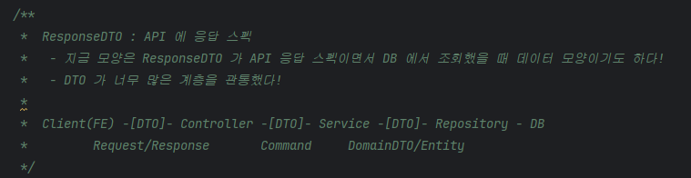 이 문제로 여러튜터님들에게 질문을 해봤을땐 일반적인 상황에선 잘발생하지않는 문제로 서비스 DTO가 존재했을때의 유지보수적인 관점등에선 오히려 손해가 아닐까 라는 답변을 받기도했다. 차라리 필드의 갯수가 적다면 RequestDto를 그대로 서비스로 보내는게 아닌 필드자체를 분해해서 파라미터로 보내는게 좀더 직관적인일수도 있다고 느낌.