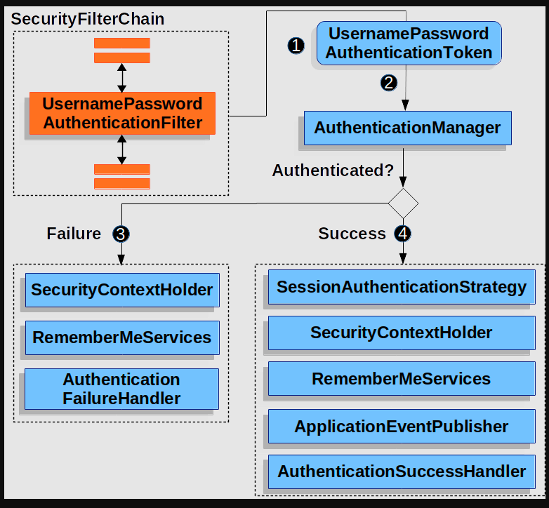 • 일반적으론 Spring Security 로 로그인하는 경우 UsernamePasswordAuthenticationFilter 를 구현하여 인증 처리를 하는것 같음. 하지만 폼로그인 방식을 사용하지도 않았고 OncePerRequestFilter 를 사용할 경우 인증처리에 대해서 좀 더 개발자가 커스텀을 할수 있는 장점이 있음.