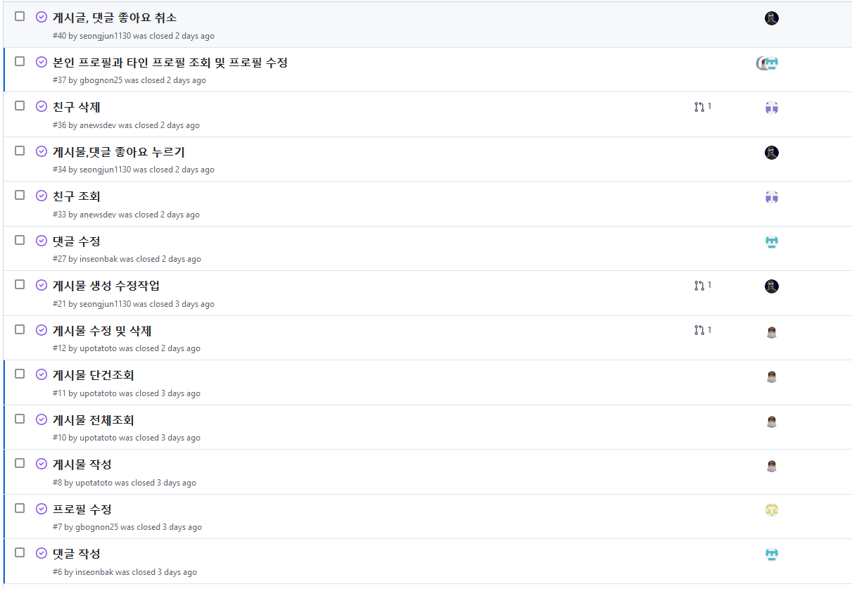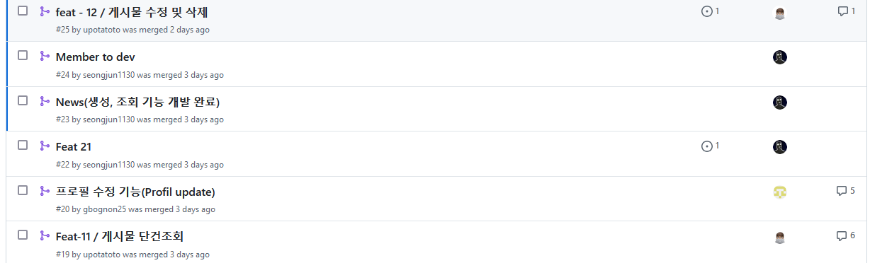 • 장점 으론 기능별 단위의 아주 작은 브랜치로 문제를 지정했기에 코드리뷰를 보는쪽에도 편했고 단위별로 테스트가 진행 된 후 합쳐지기때문에 테스트에 대한 신뢰성이 보장되었음.