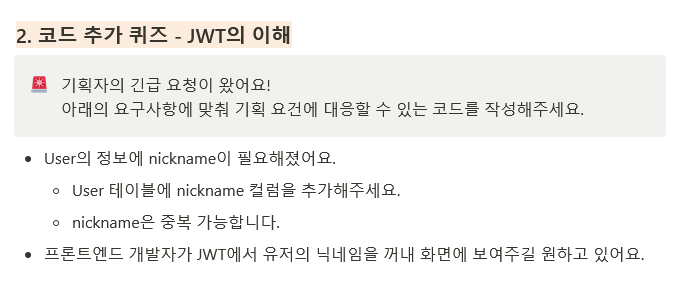 - User 테이블에 nickName 컬럼을 추가해주고 FE단에서 JWT를 이용해 nickName을 원하기에 토큰을 생성할때 nickName을 포함하도록 리팩토링하였다.