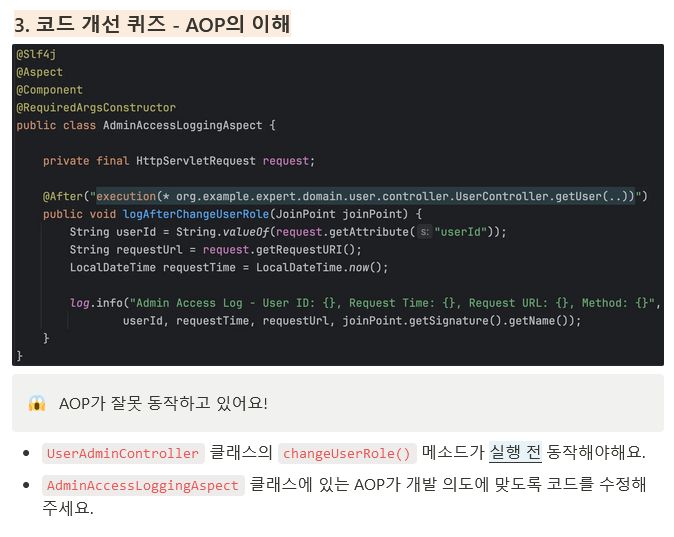 @After 어노테이션을 통해 해당 메소드가 실행 후 로그가 찍히게 끔 설정이 되어져있다. 또한 경로가 ("execution(* org.example.expert.domain.user.controller.UserController.getUser(..))") 으로 되어있기에 요구사항과 맞지않는 포인트컷을 소유하고있다.
