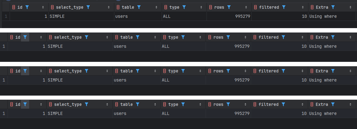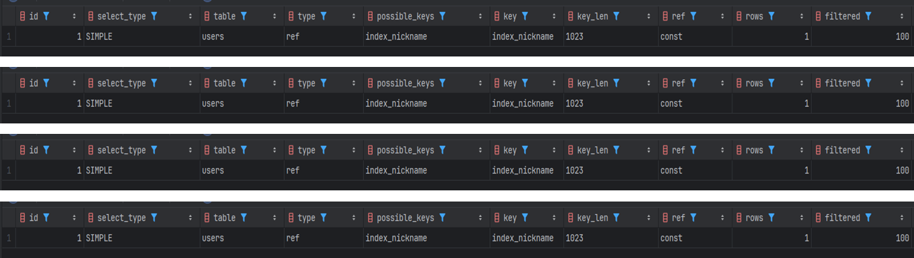검색속도 에 대한 변경사항(API 실행시간, 메모리 상태, 네트워크 딜레이 등) 이 너무많다 생각하여 MySql EXPLAIN 을 통해 DB 기준의 검색 성능 을 같이 측정하였다.