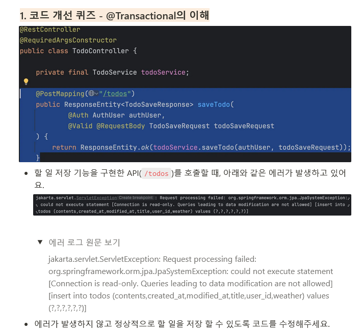 @Transactional(readOnly = true) 설정이 되어져있어 읽기 전용 상태이지만 데이터 삽입 작업인 saveTodo() 가 데이터를 삽입하려 할때 오류가 발생하고 있다.