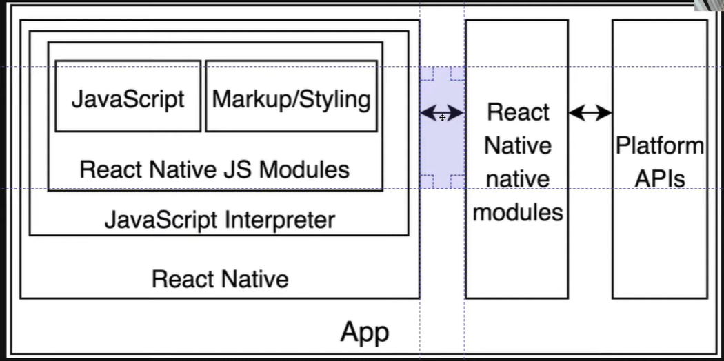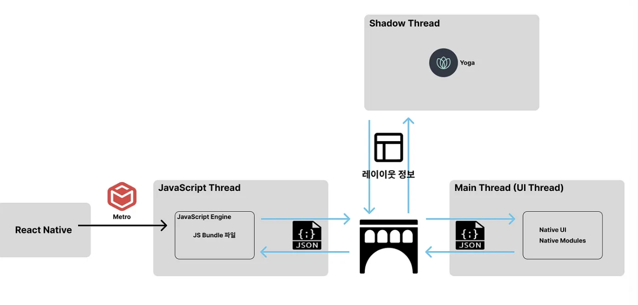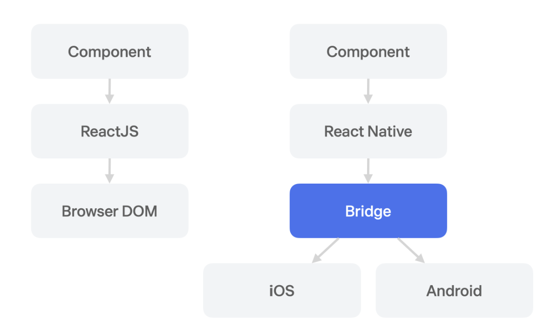 react native는 런타임 중에 js 브릿지를 생성하고, 자바스크립트 코드를 네이티브 코드로 변환해서 컴파일한다. 브릿지를 통해 네이티브 UI에 접근한다.