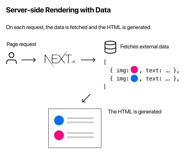 정적 생성은 빌드 시 한 번 발생하므로 자주 업데이트되거나 사용자 요청마다 변경되는 데이터에는 적합하지 않습니다. 이와 같이 데이터가 변경될 가능성이 있는 경우 서버 측 렌더링을 사용할 수 있습니다. 다음 섹션에서 서버 측 렌더링에 대해 자세히 알아보겠습니다.